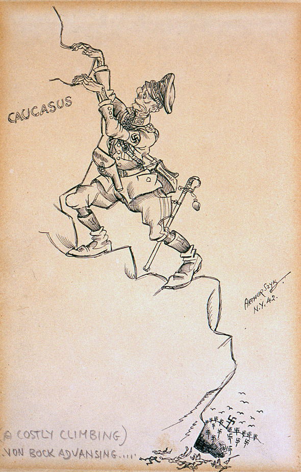 SZYK, Arthur. “A Costly Climbing… Von Bock Advancing.” Signed and Dated “Arthur Szyk, N.Y. (19)42”. Black ink and pencil on paper. Sheet size: 9″ x 6″. Image size: 8 11/16″ x 5 1/2″. Very Good condition.