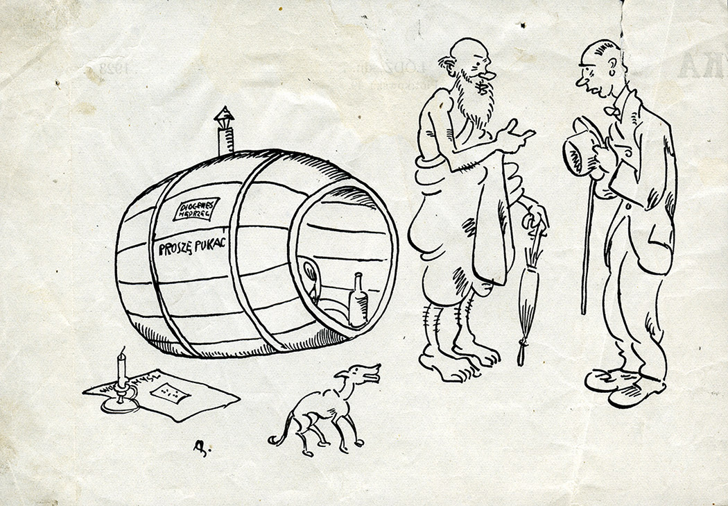This cartoon by Arthur Szyk shows the Greek Cynic philosopher Diogenes, who defied social convention in order to return to what he regarded as a state of nature. The drawing features the bearded and barefoot Diogenes having just emerged from the barrel (in the left of the picture) where he lives. He wears a tunic and carries an umbrella in his left hand. The thumb and index finger of his right hand are pointed to the right, toward a man with whom Diogenes is speaking. In contrast to Diogenes’ appearance, his interlocutor wears a suit and carries a hat and cane. A ventilation shaft is seen rising out of Diogenes’ barrel, a few household items are visible within, and the side of the barrel bears a sign reading “DIOGENES MĘDRZĘC,” which is Polish for “Diogenes the Sage.” Beneath this sign, another notice in Polish reads “PROSZĘ PUKAĆ,” or “PLEASE KNOCK.” A candlestick and a sheet of paper lie on the ground beside the barrel. The heading of the piece of paper says, “WYMYŚL,” meaning “GADGET.” Finally, a small dog stands behind Diogenes at the bottom-center of the picture. Here Szyk makes a joke, since the name “Cynic” in Greek means “like a dog.”
