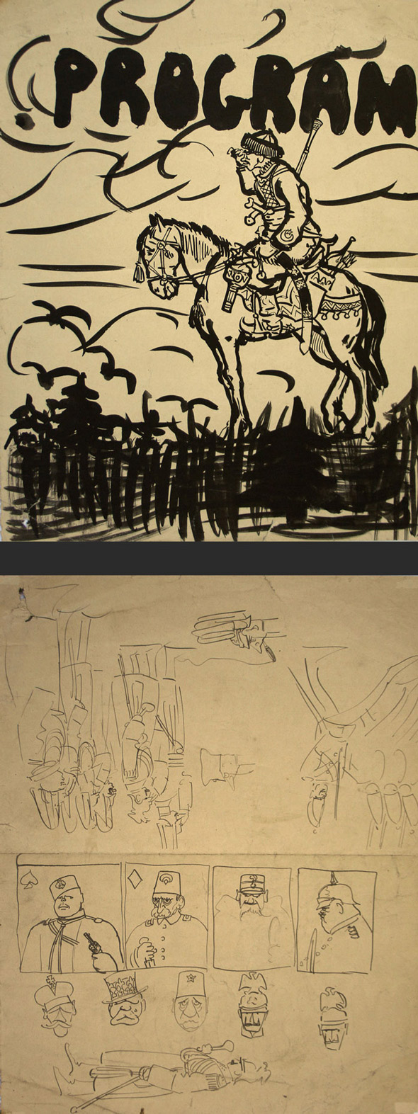 In the bottom scene, Szyk experiments with designs for playing cards. He sketches out four potential cards along the top, all showcasing grizzly looking soldiers with grim countenances. Along the bottom he sketches out five more heads wearing distinctive hats and helmets, all of which appear to be military leaders of some sort.