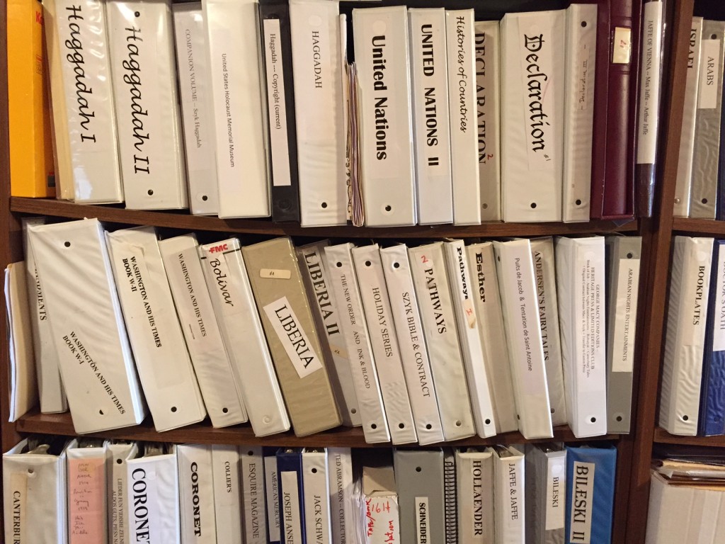 This section consists mostly of secondary material that serves as invaluable reference material to accompany the primary resource material in The Archives. More than one hundred-fifty three-ring binders are included in this section; several focus on the background of numerous Szyk illustrated books (e.g. contracts with The Limited Editions Club), and publishers who knew Szyk (e.g. Max Jaffe and Kasimir Bileski who published Szyk’s portfolio of Washington and His Times and the United Nations series, respectively); other binders focus on subject matter as diverse as Szyk’s investigation by the House on Un-American Activities committee, Szyk on Broadway, Bookplates created by Szyk, War Savings Bonds and the Treasury Department. Many binders contain information surrounding Szyk museum exhibitions over the past two decades. In this section is also found Julia Szyk’s unpublished memoirs and important Haggadah-related source material. Original photographs of Arthur Szyk and his family are included here as well as important Haggadah related source material. And there are also four binders documenting forgeries of Arthur Szyk art.